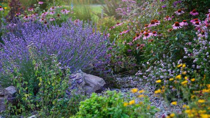 - Лаванда. Растение ценится не только за нежный фиолетовый цвет и приятный аромат, но и за неприхотливость. Она прекрасно переносит жару и засуху, не требует частого полива и подкормки. Компактные кустики образуют аккуратные бордюры, а цветы привлекают полезных насекомых.